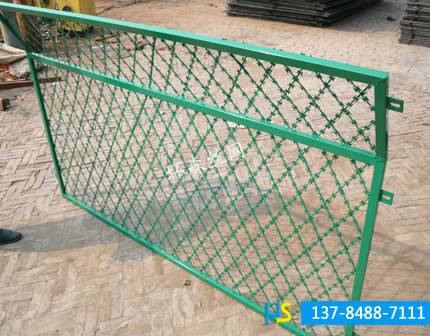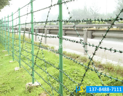 刺絲刺繩護欄網(wǎng)網(wǎng)也稱為刀片刺絲護欄網(wǎng)、刀片刺網(wǎng)護欄網(wǎng),是一種新型護欄網(wǎng)產(chǎn)品。是在兩條刀片刺網(wǎng)之間以不銹鋼片和鍍鋅鋼片強力夾扣,展開后即呈交叉狀。它具有嚇阻效果好、美觀、施工便利,經(jīng)濟實用等優(yōu)異特點。主要用于園林公寓,機關單位,監(jiān)獄,哨所,邊防等的圈禁防護。刀片刺網(wǎng)是由熱鍍鋅鋼板或不銹鋼薄板沖壓處尖銳的刀片狀,高張力鍍鋅鋼絲或者不銹鋼絲做芯線組合而成的阻絕器材。由于刺網(wǎng)造形獨特不易觸摸,因而能達到極好的防護隔離效果。
