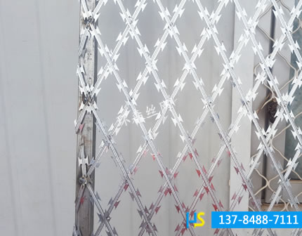 交叉型刀片刺網(wǎng):螺旋型交叉式刀片刺網(wǎng)系在兩條刀片刺網(wǎng)之間以不銹鋼片和鍍鋅鋼片強力夾扣,展開后即呈交叉狀,使其美觀又實用。